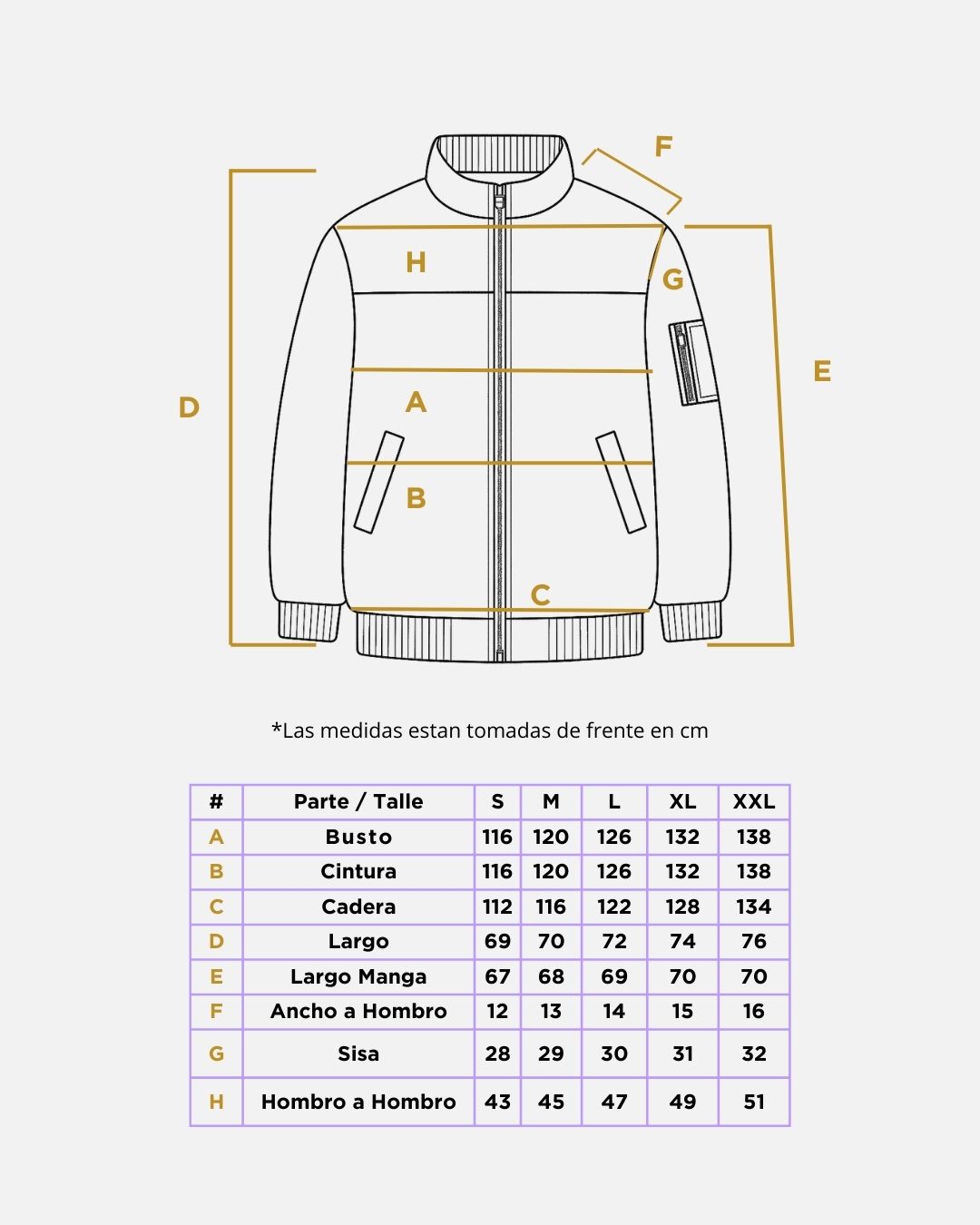 Si vas a utilizar un abrigo debajo de la campera te recomendamos llevarte un talle más.